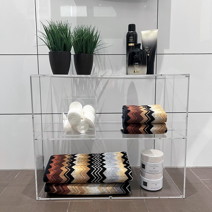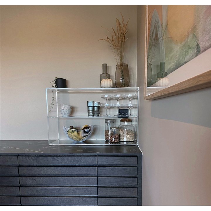 - Leveres med 6 stk. transparente gummiknotter som kan festes under hyllens bunnplate