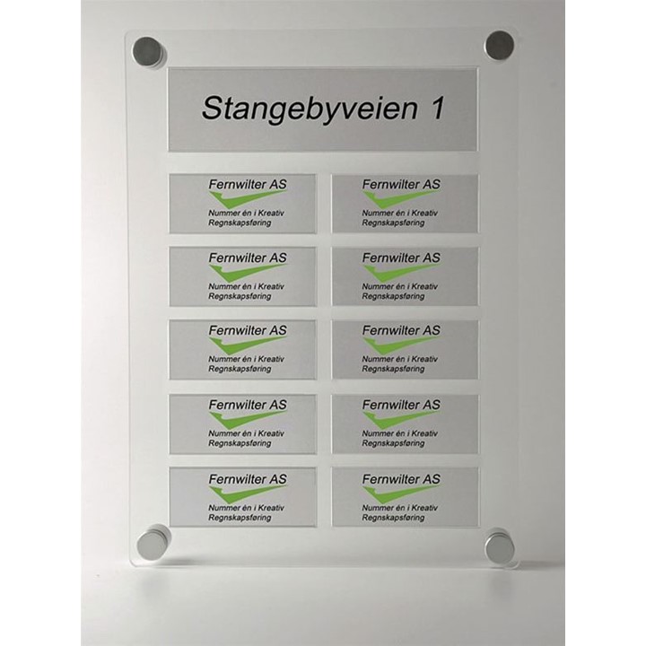 | Annet | Inklusive 10 stk avstandshylser i børstet aluminium med dia. Ø25mm. Anbefalt størrelse på tekstfelt 1960x1440mm. |