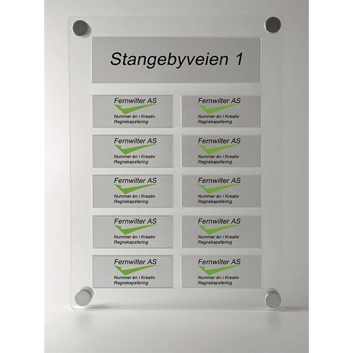 | Annet | Inklusive 6 stk avstandshylser i børstet aluminium med dia. Ø25mm. Anbefalt størrelse på tekstfelt 920x590mm. |