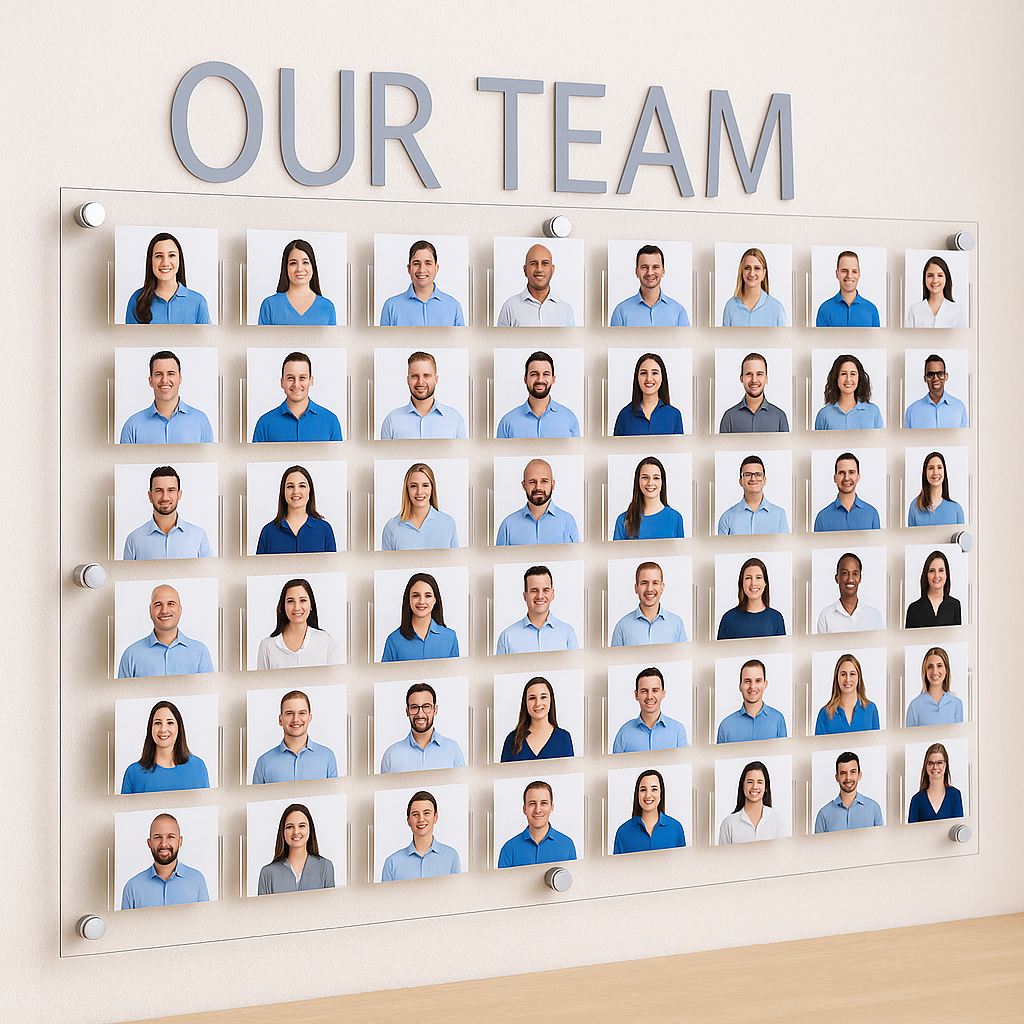 Tavle/display for presentasjon av f.eks ansatte på avdelingen, i bedriften el.Beregnet på bilder/info i format 150x105mm. 12 stk foto pr. rad