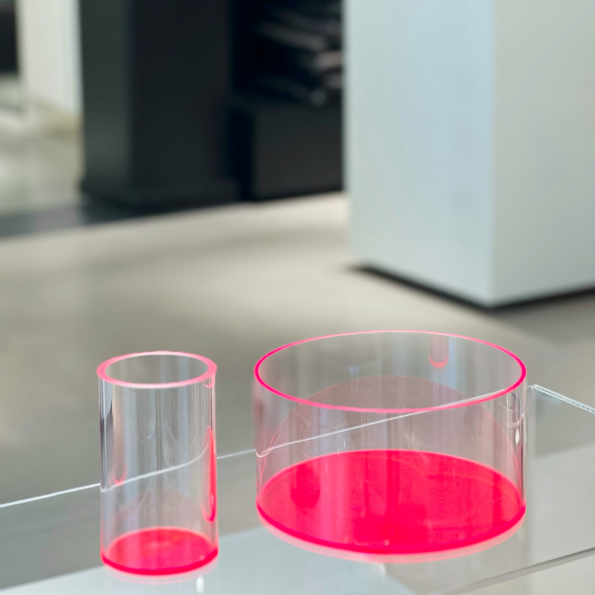 Sett med 3 runde bokser/sylindere som kan stables i hverandre. Den fluoriserende bunnen gir en spennende effekt. Kan også sette med bunn opp og brukes som små podier i f.eks. vindusutstilling.