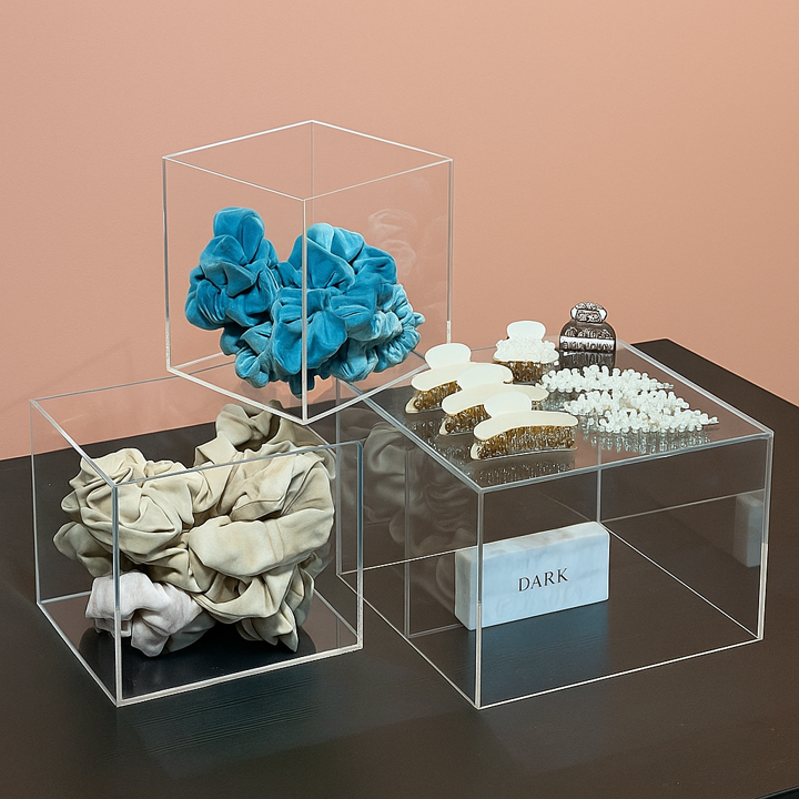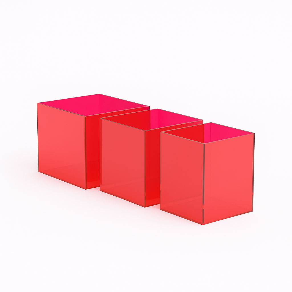 Sett med 3 bokser som kan stables i hverandre. Passer også som små podier i vindusutstilling/vinduskarm/hyller etc.Kan brukes til "alt" og er like egnet til utstilling/profilering, på kontoret eller hjemme.