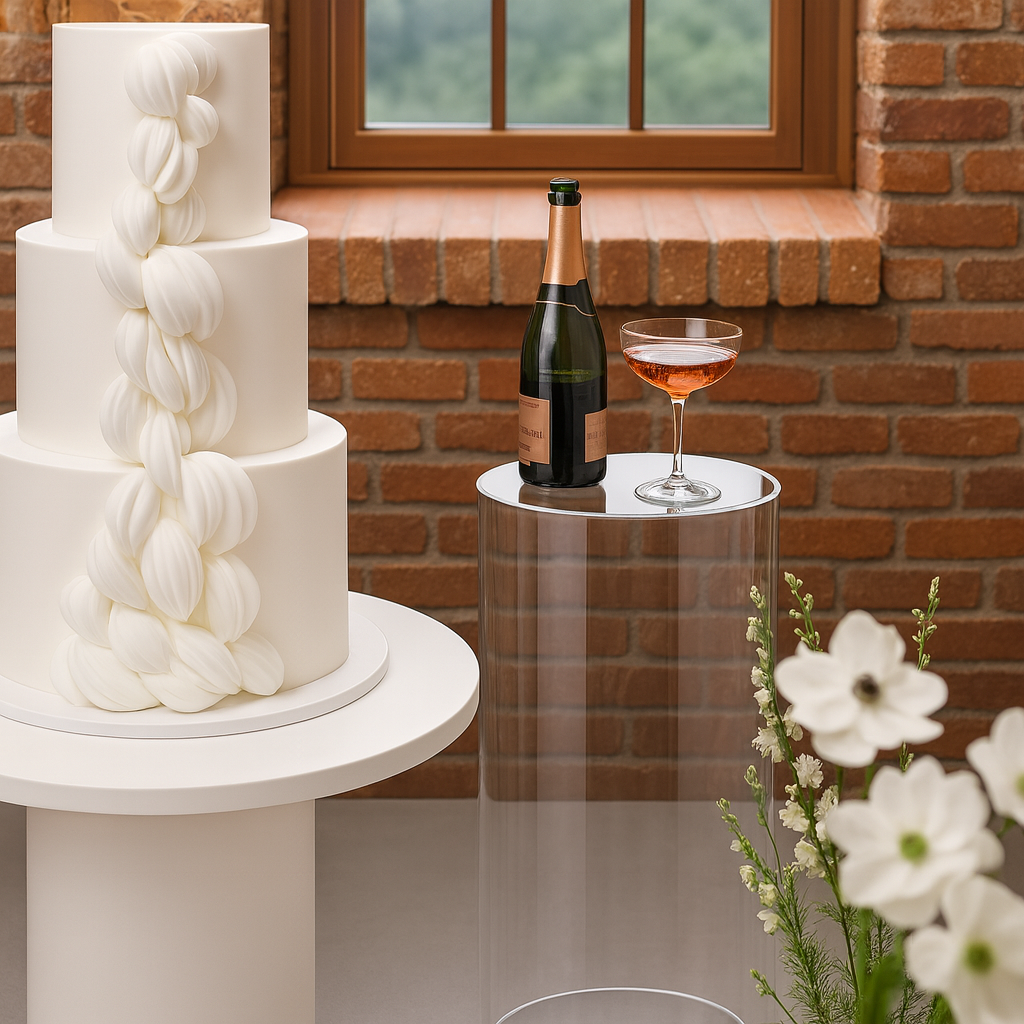 Sett med 2 stk runde podier/bokser/sokler.Utallige bruksområder. Leveres med pålimt bunnplate og løst lokk.Kan snus og benyttes med åpen bunn for dekor med belysning, ballonger, blomster eller annet.