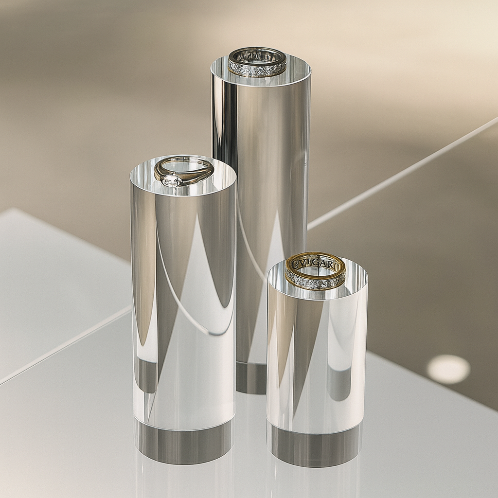 Massiv akryl bolt med 40mm diamater. Glassklar med polerte ender.Til eksponering av mindre gjenstander som feks. ringer.Skap en spennende utstilling med profilering i flere ulike høyder.