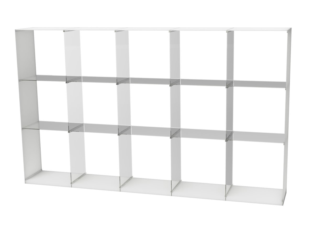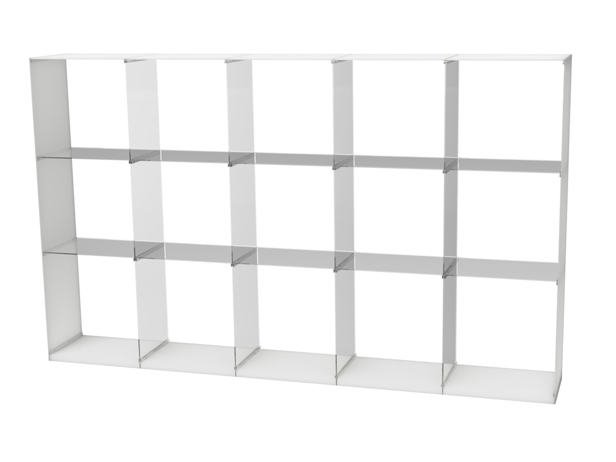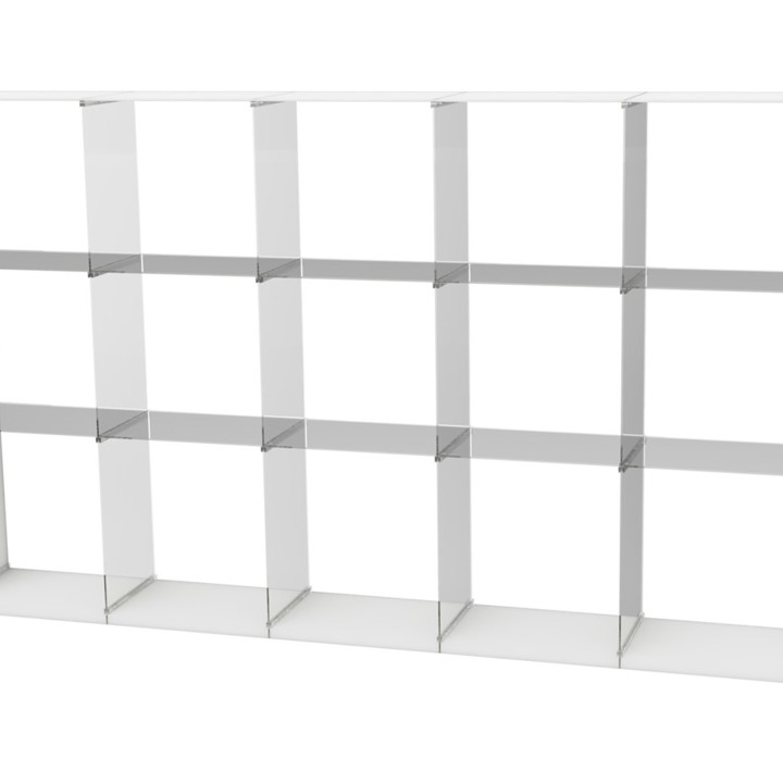 Frostet plexiglass i ramme og klart plexiglass i innvendig hyller/skiller.