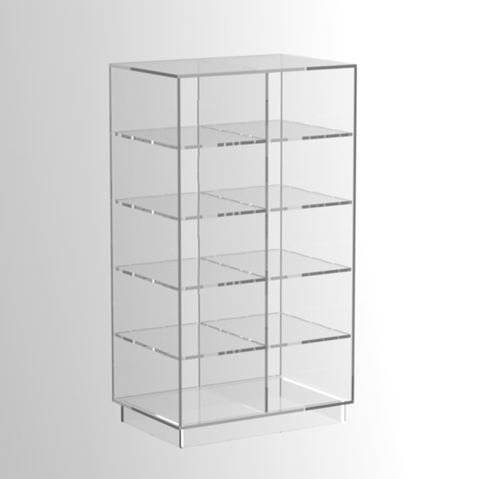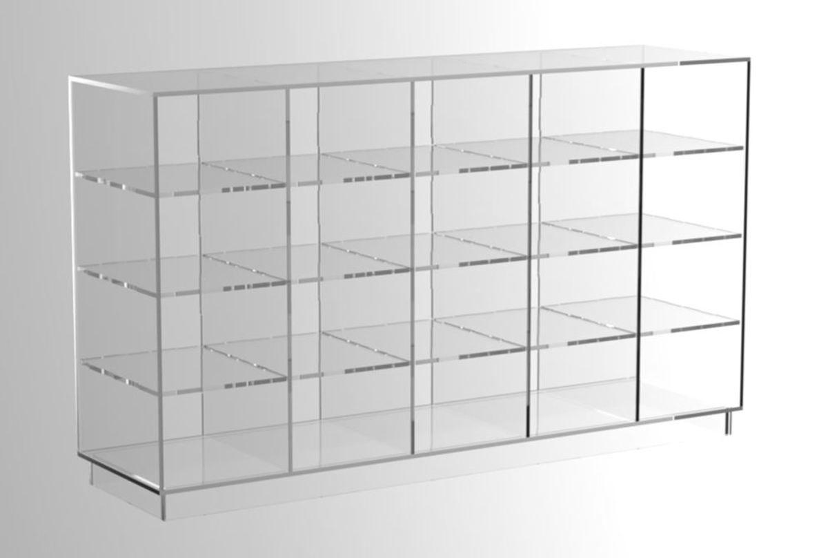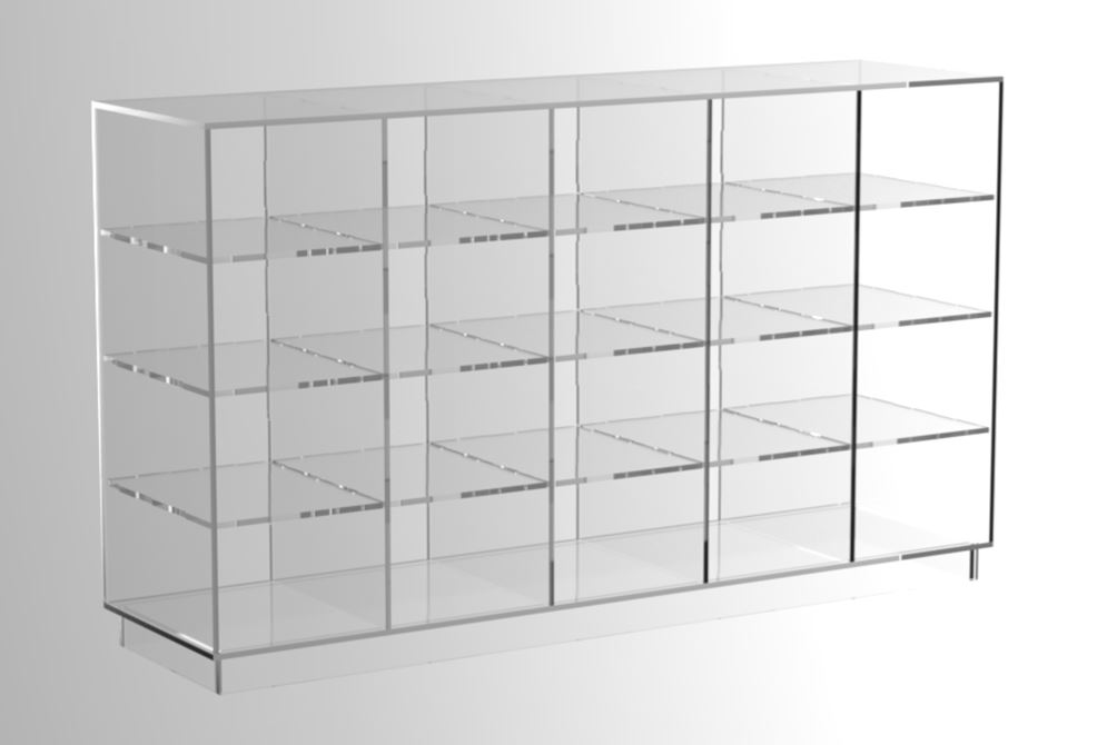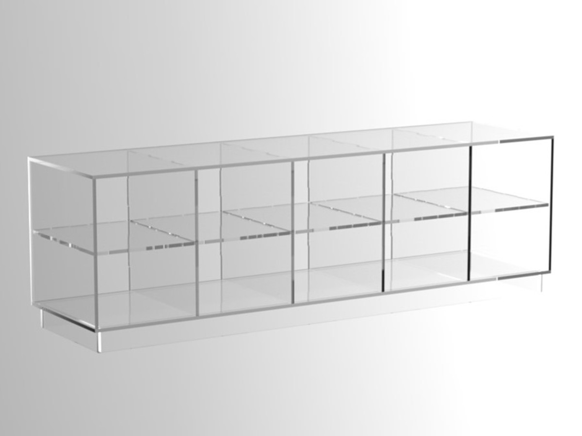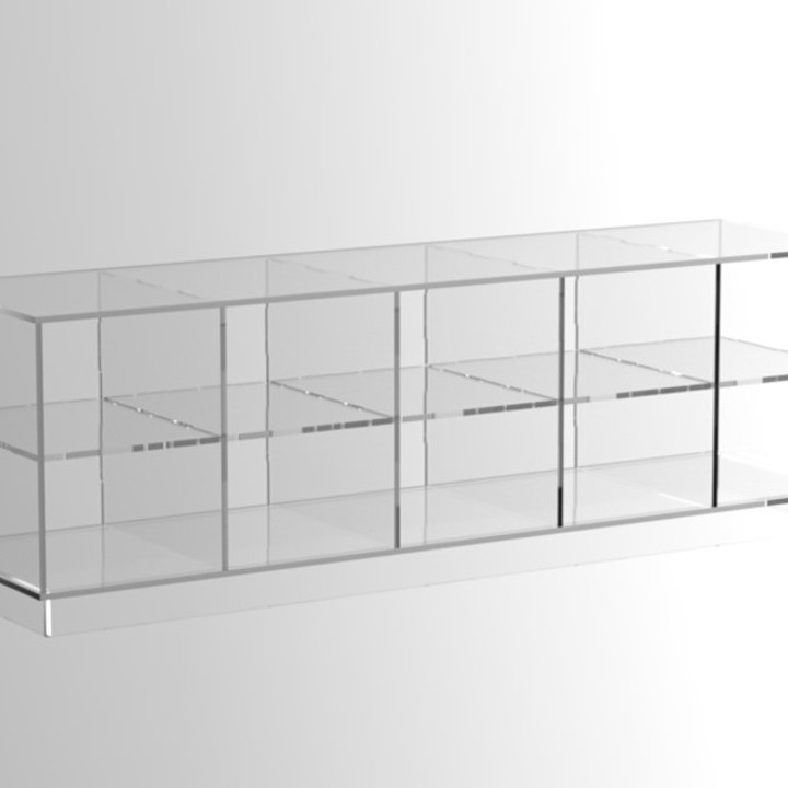 Praktisk hylle eller romdeler i klart plexiglass med bakplate og sokkel i bunn.Innvendige mål pr. rom BxDxH: 240x330x160mm - tilpasset A4 materiell/brosjyrer.