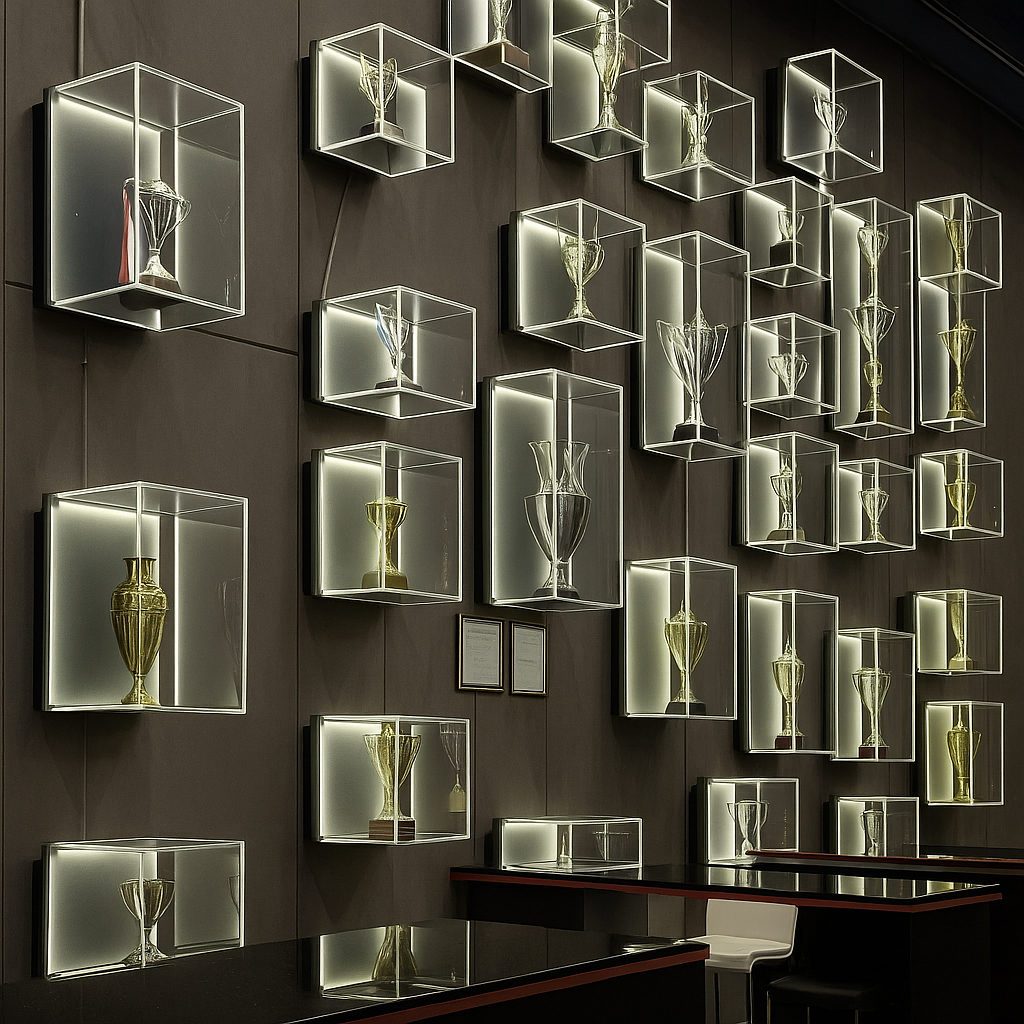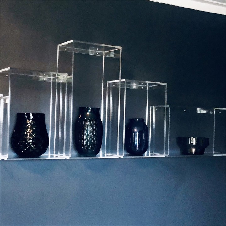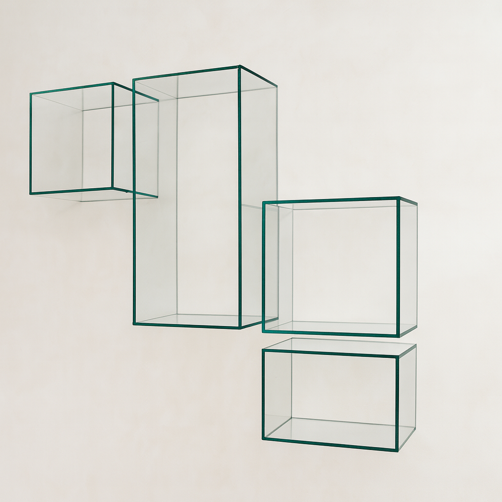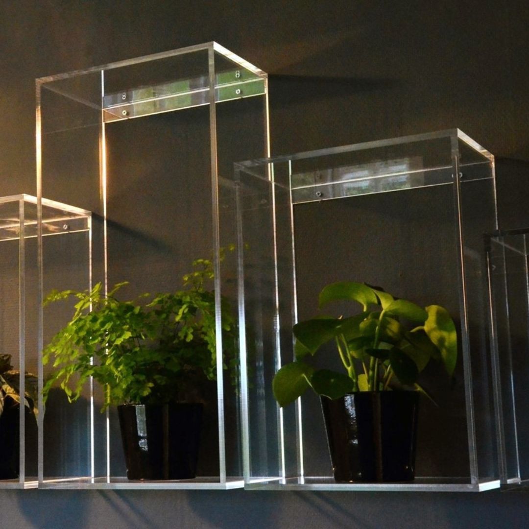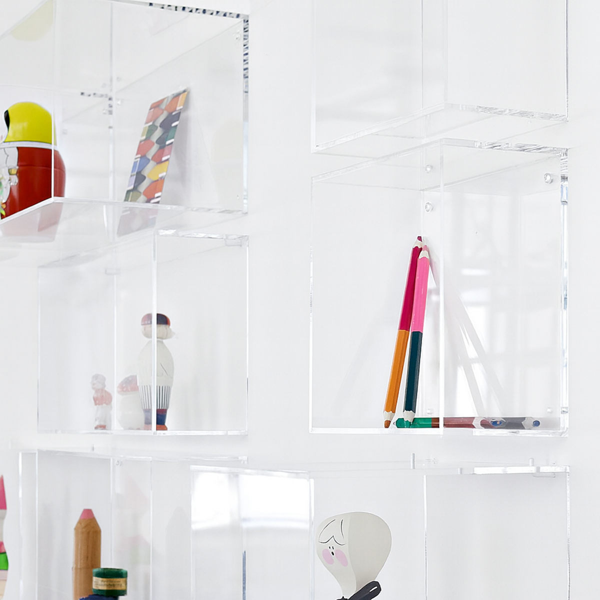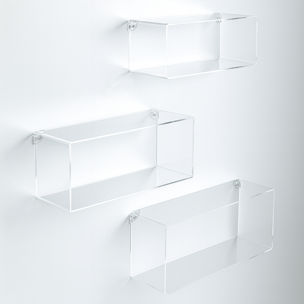 Vegghylle i plexiglass for eksponering og oppbevaring. Like bruksvennlige hjemme som i bedriften eller til utstilling. Hylleboksen er åpen og leveres uten front/bakplate, men med 4 sider.