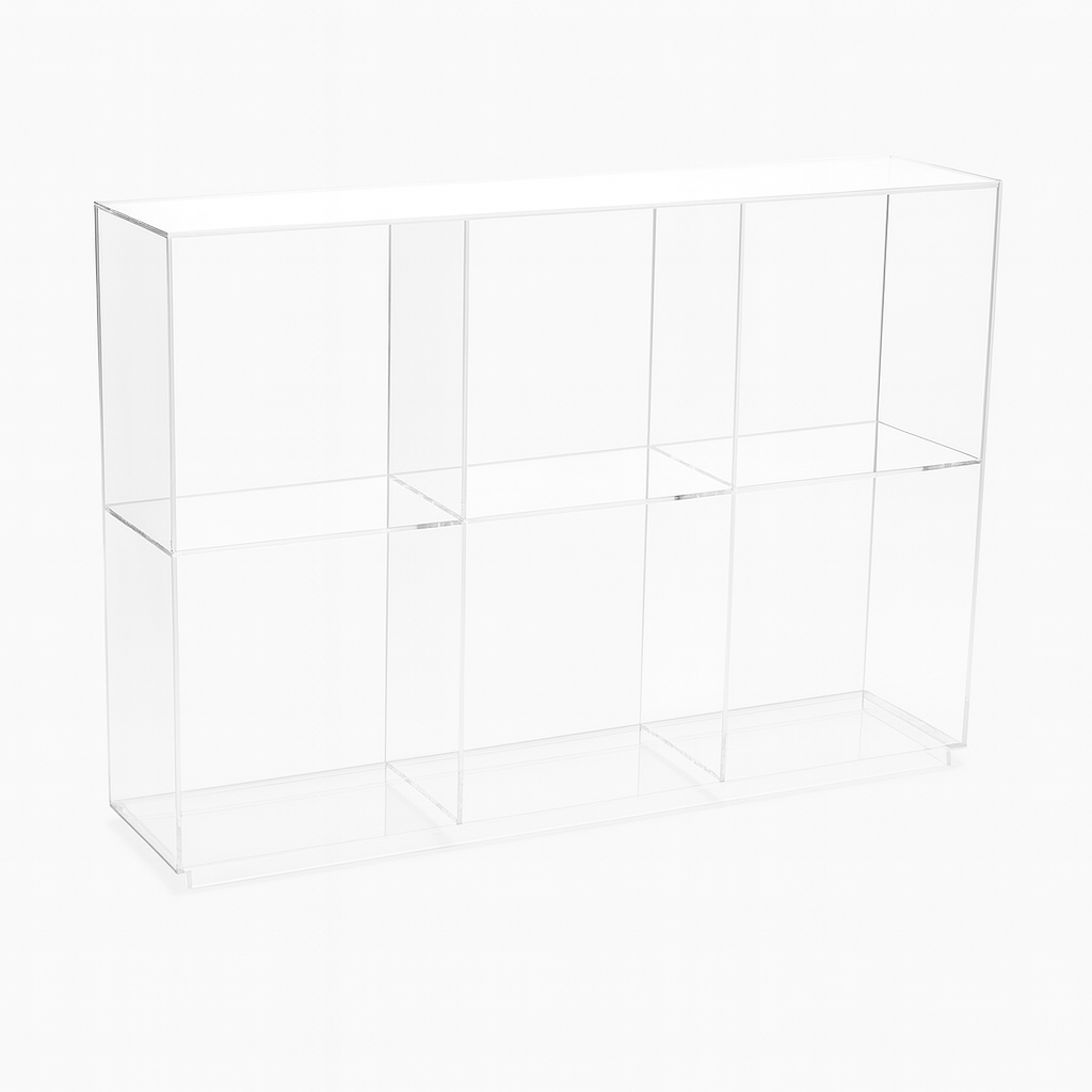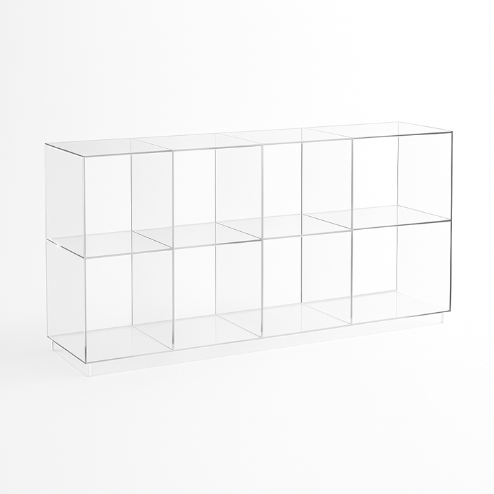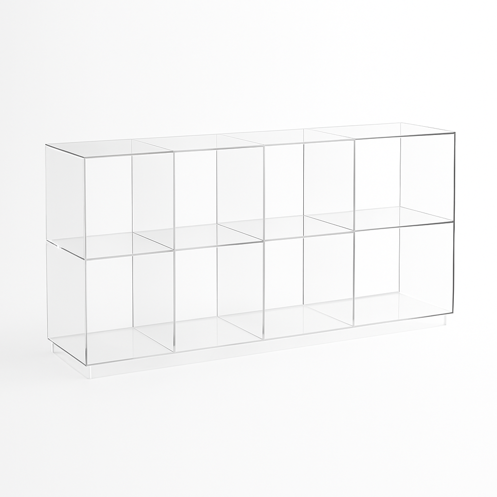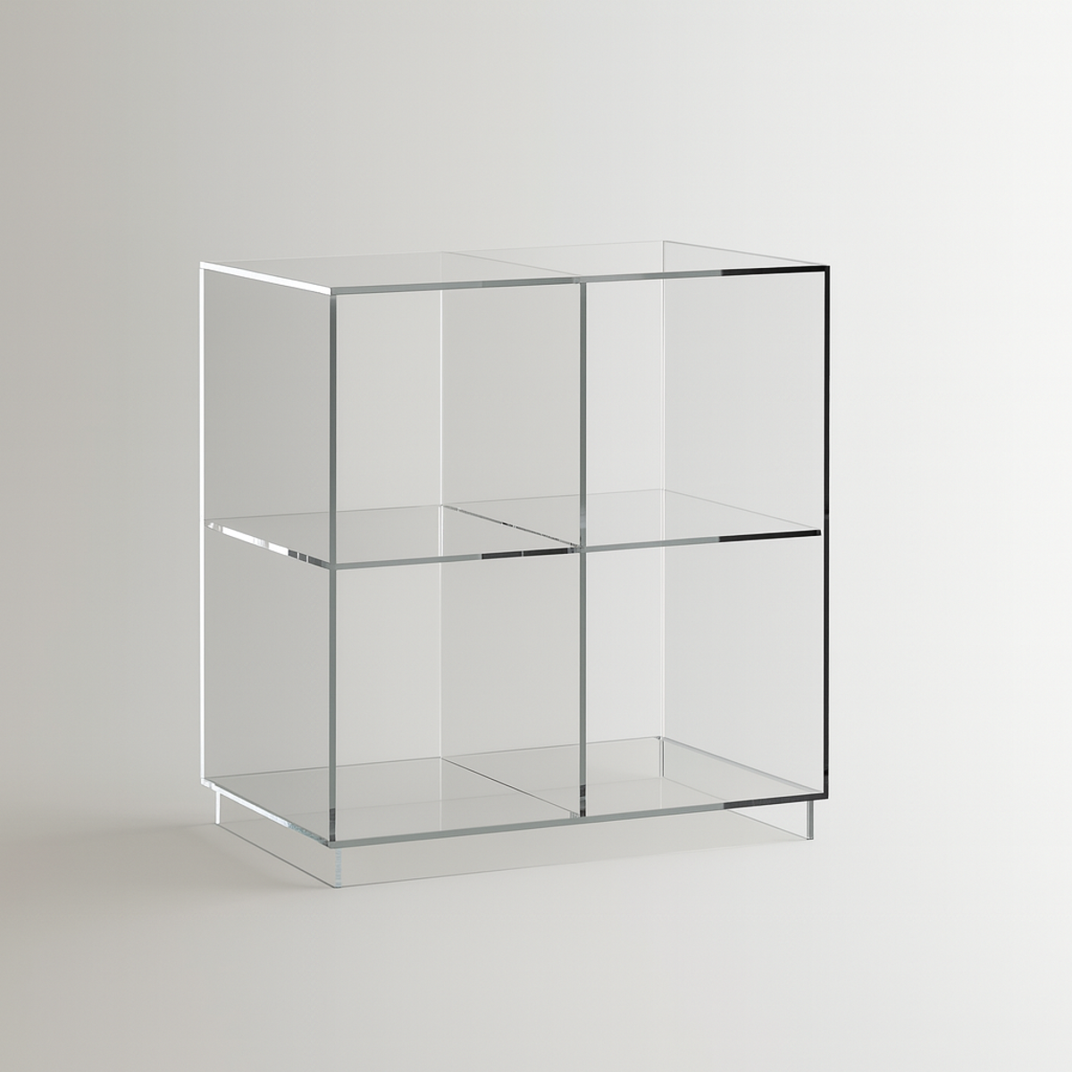 Synne hylleseksjon i solid plexiglass med kvadratiske rom.Passer også som romdeler eller display.Pleksiglass hyllen leveres uten bakplate og dermed har du mulighet til "profilering" fra 2 sider.Leveres med sokkel (høyde 50mm).
