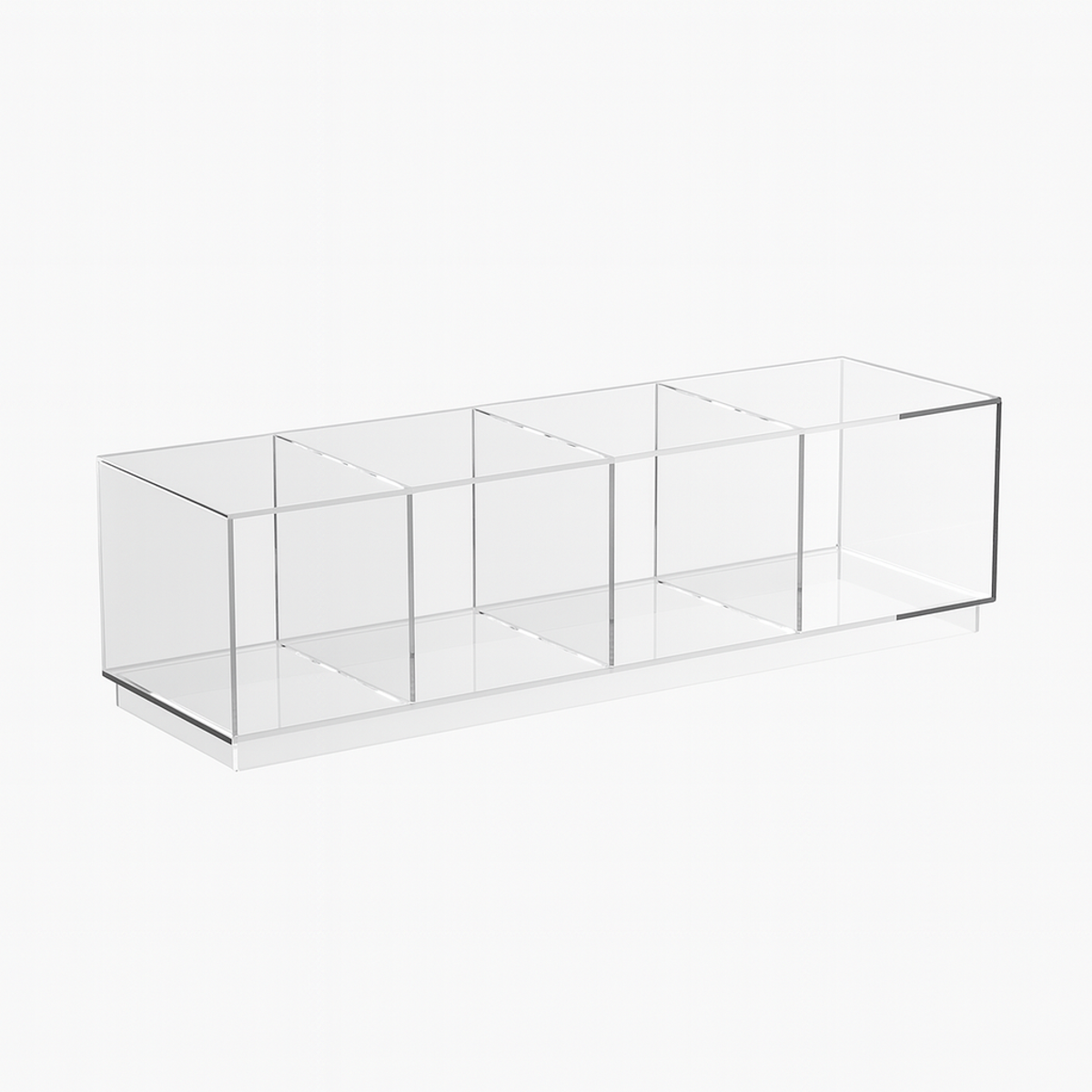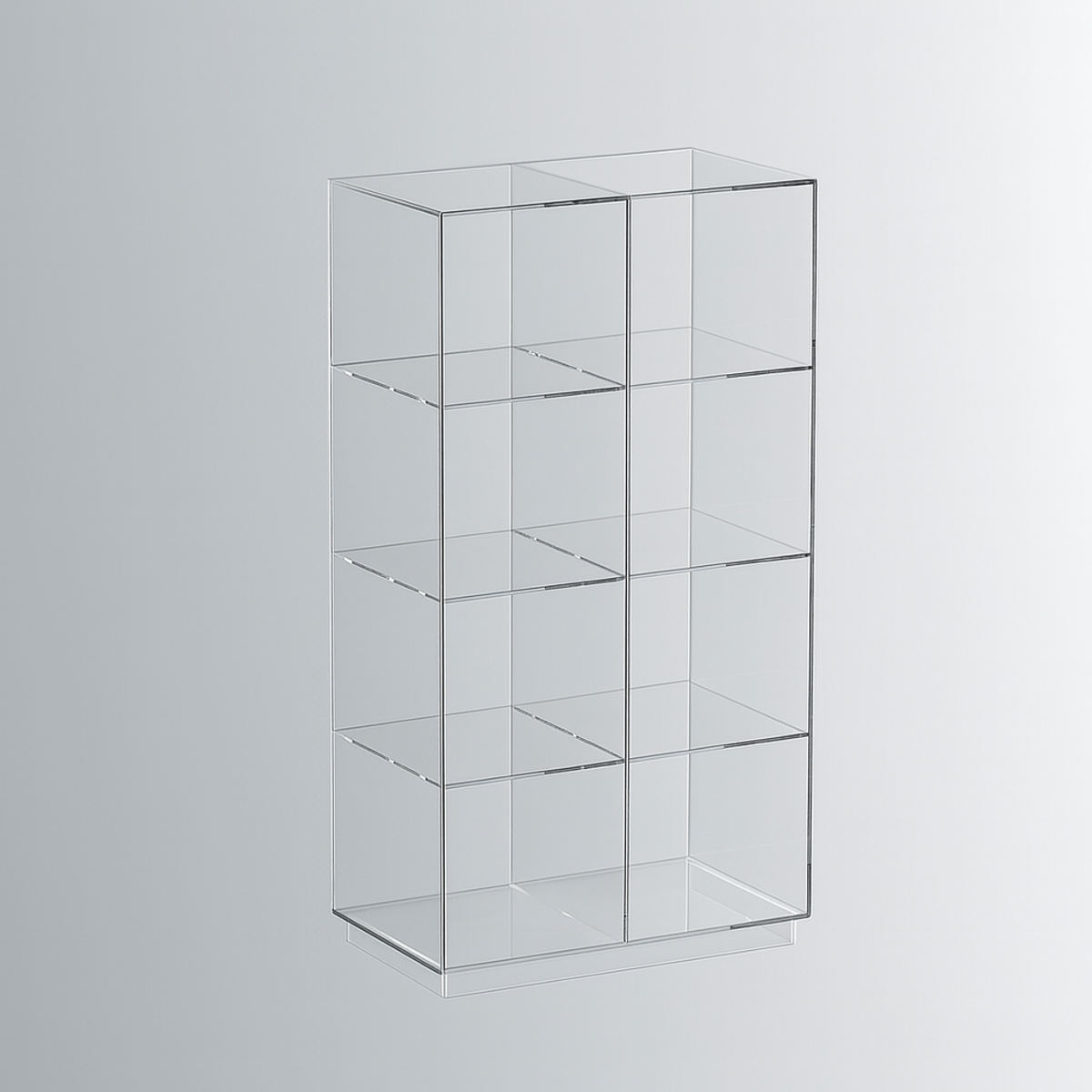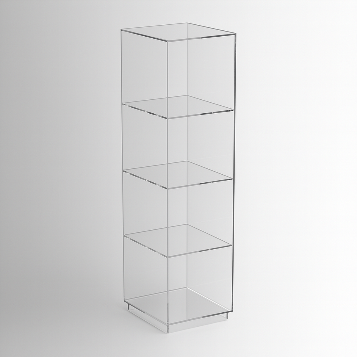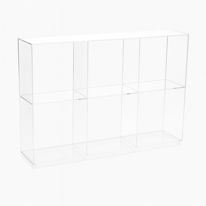 Synne hylleseksjon i solid plexiglass med kvadratiske rom.Passer også som romdeler eller display.Pleksiglass hyllen leveres uten bakplate og dermed har du mulighet til "profilering" fra 2 sider.Leveres med sokkel (høyde 50mm).